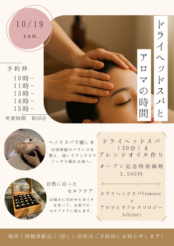 ドライヘッドスパ flowcare × アロマ hibiyori 自然に寄り添い、心と体をやさしく整える時間。