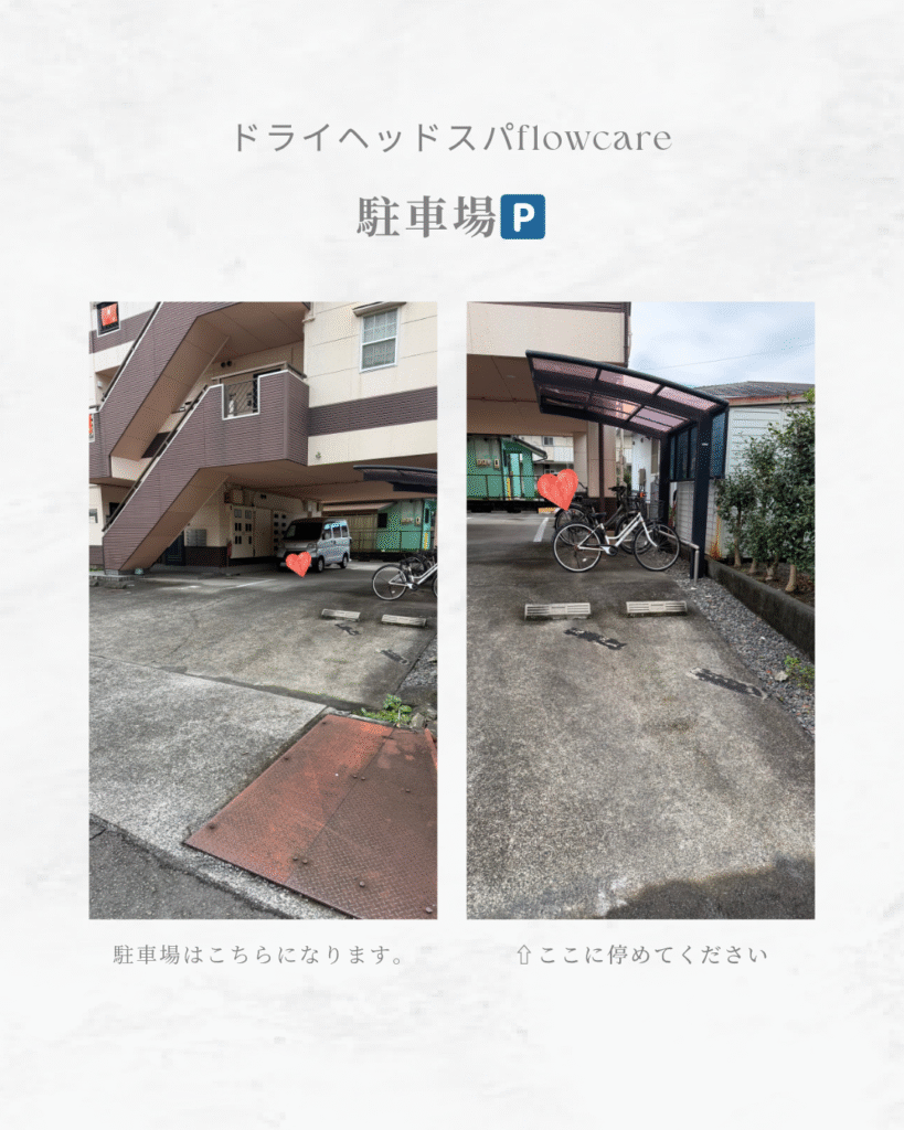 当サロンの駐車場は1台分ございますが、少し狭くなっており、停めにくい場合がございます。ご不便をおかけしてしまい申し訳ありません。